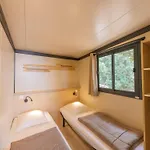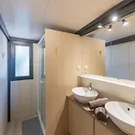 Von dieser Familien- Villa aus hat man einen Blick auf die Terrasse. Zur Ausstattung des Badezimmers gehören auch eine Dusche und ein Waschbecken.
